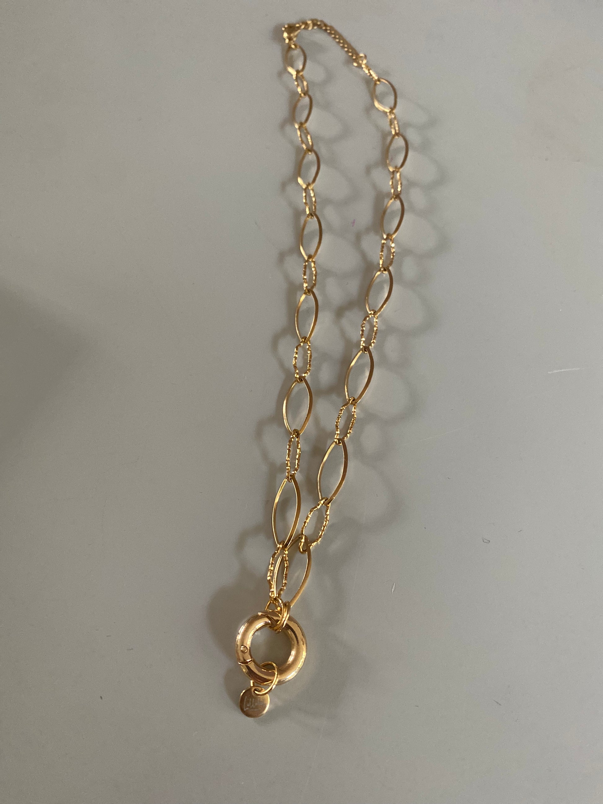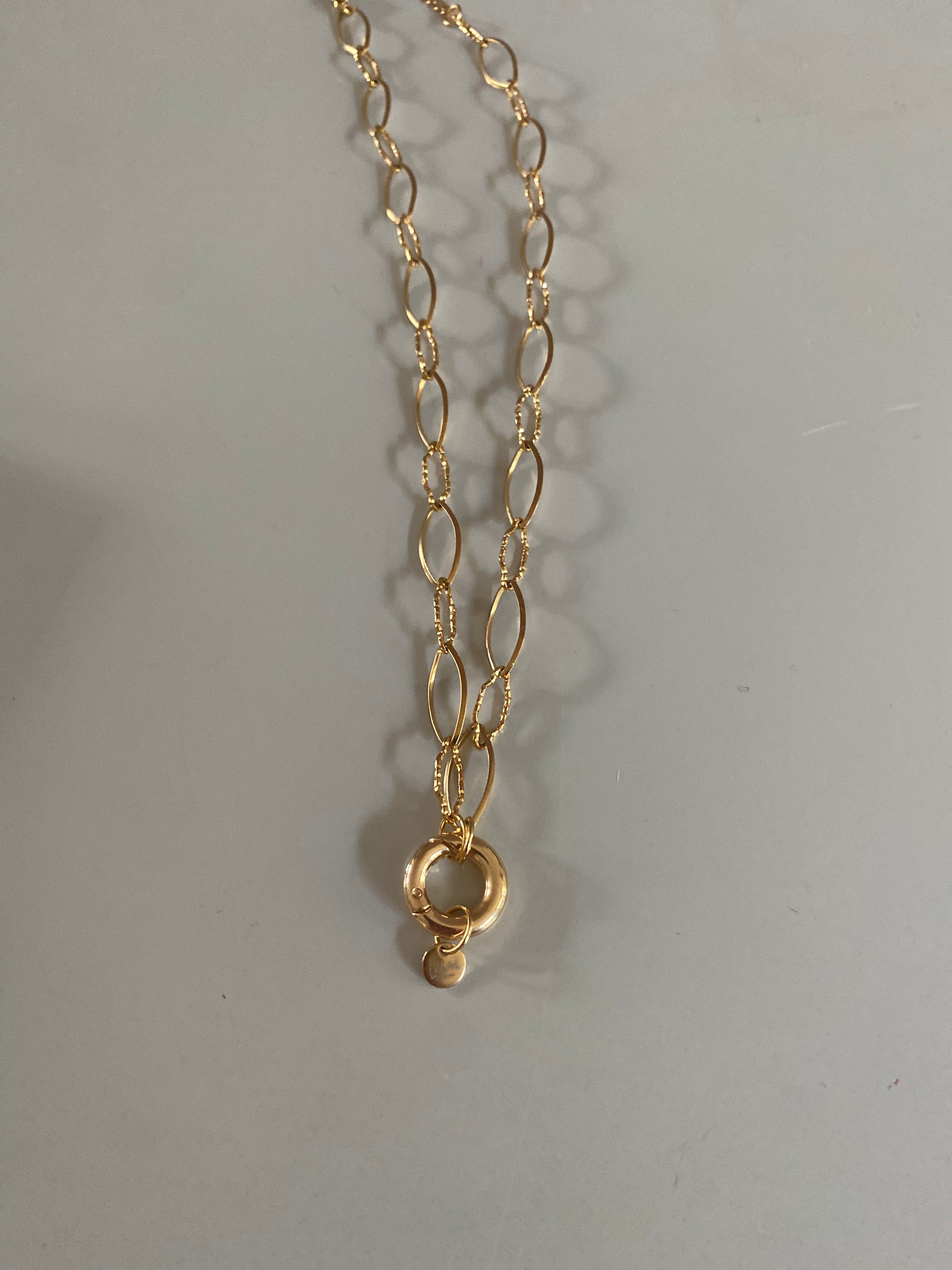 Schakelkettingen zijn tijdloos en veelzijdig – en dit ontwerp vormt daarop geen uitzondering. De ketting is ca. 45 cm lang, met een extra verlengstuk van 5 cm. In het midden zit een metalen o-ring die niet wordt gebruikt als sluiting, maar speciaal is bedoeld om bedels aan te hangen en te verwisselen.