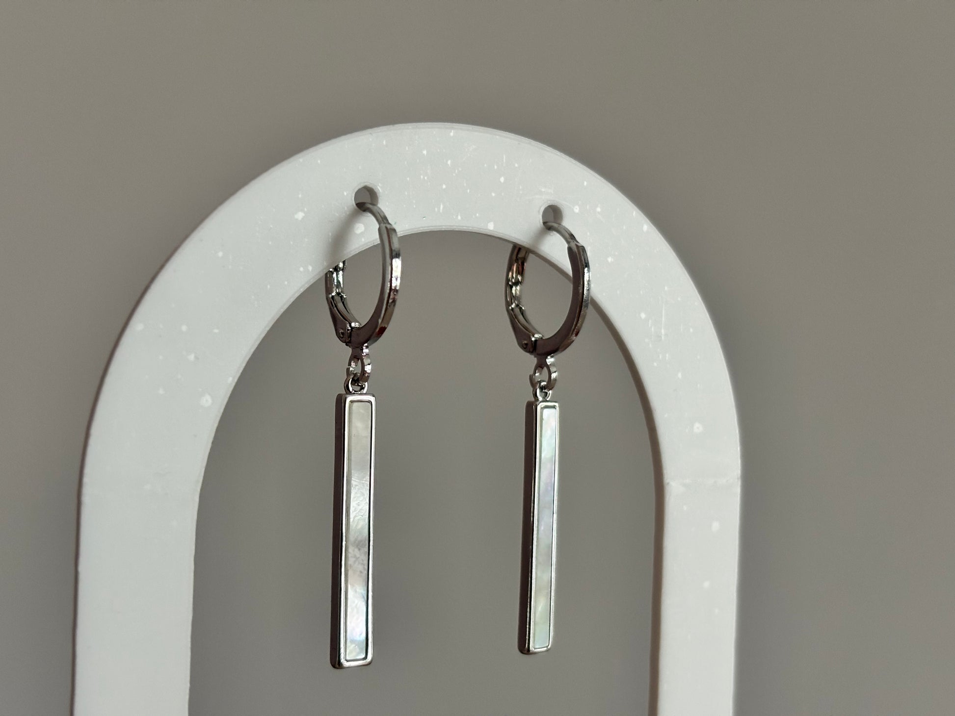 Deze korte oorbel heeft een rustige uitstraling. Het ontwerp bestaat uit een zilverplated oorringetje met daaronder een shell staafje, wat zorgt voor een zachte glans.