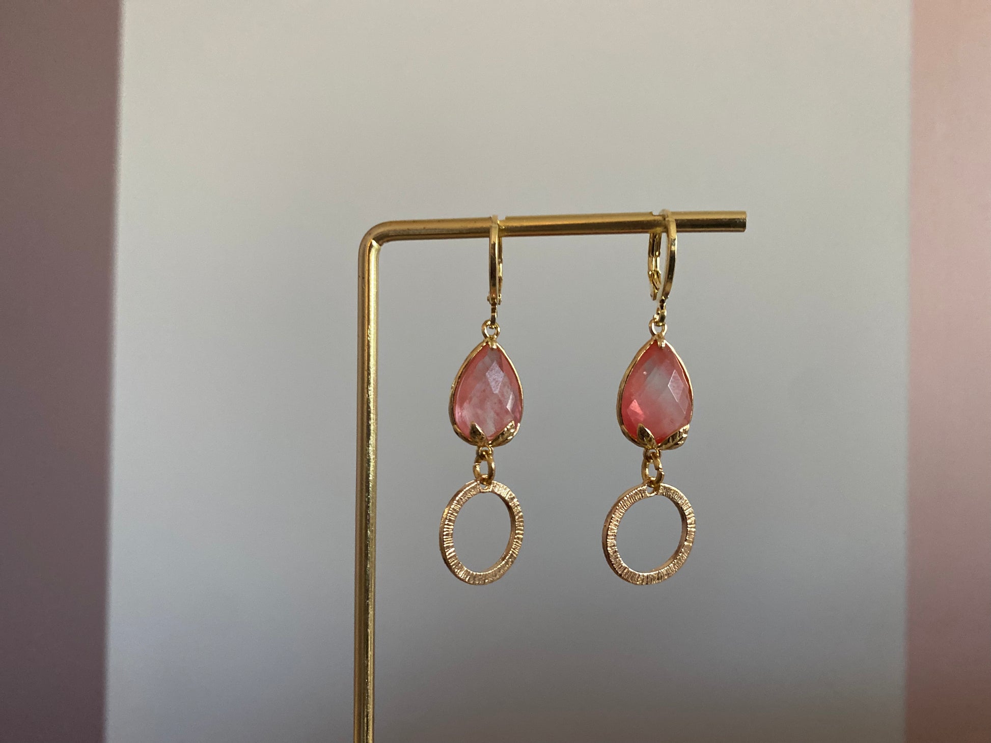 Deze korte oorbel straalt luxe uit door de roze peervormige steen, afgewerkt met subtiel bladgoud voor een rijke, warme glans. Onder de steen hangt een kleine gehamerde cirkel die het geheel een verfijnde look geeft. Een elegante, compacte eyecatcher van ca. 3 cm — perfect voor zowel dagelijks gebruik als feestelijke momenten.