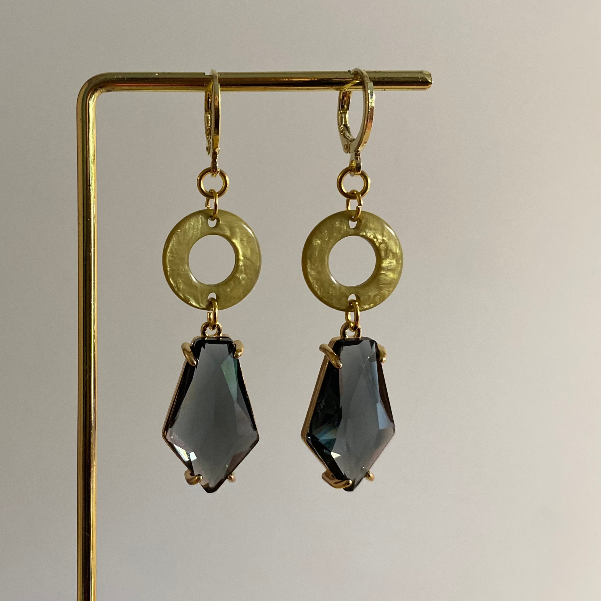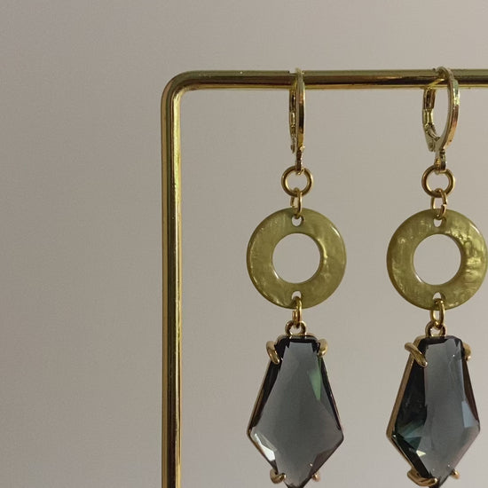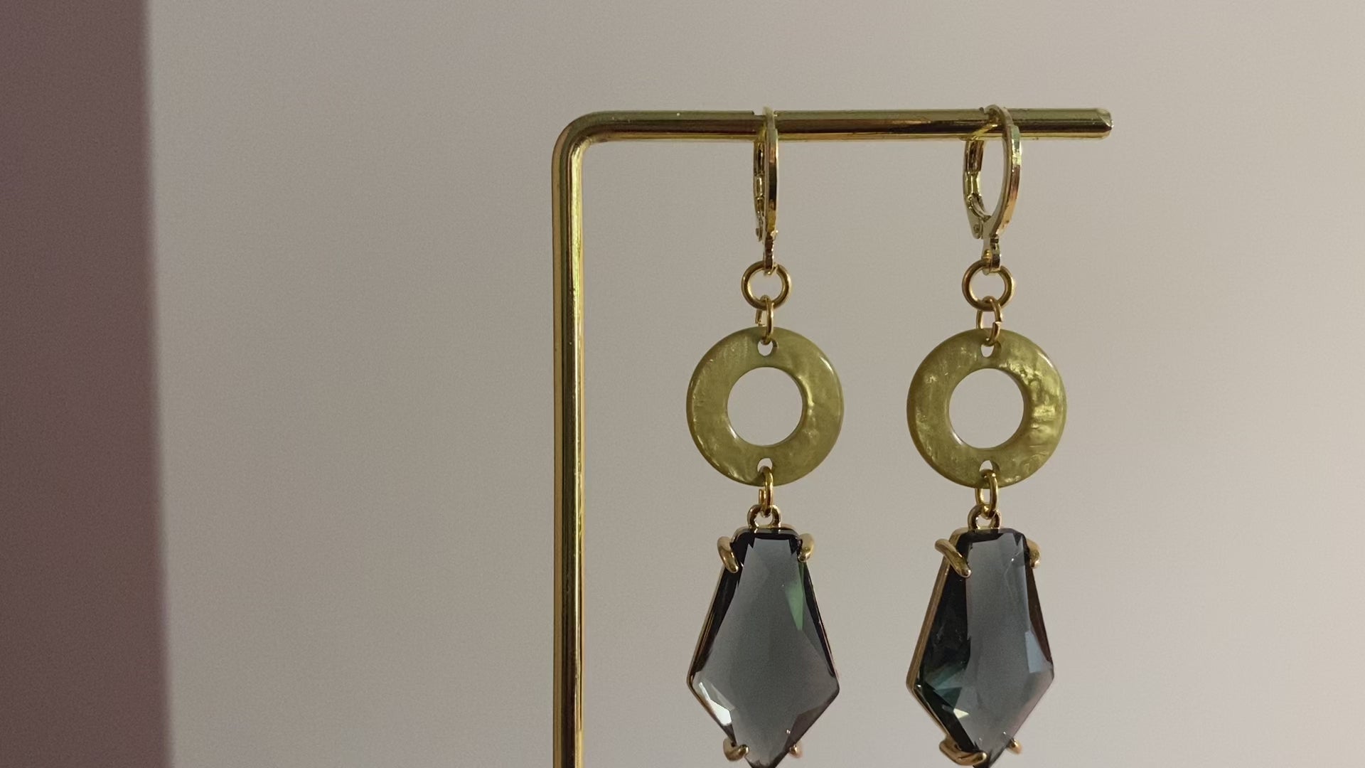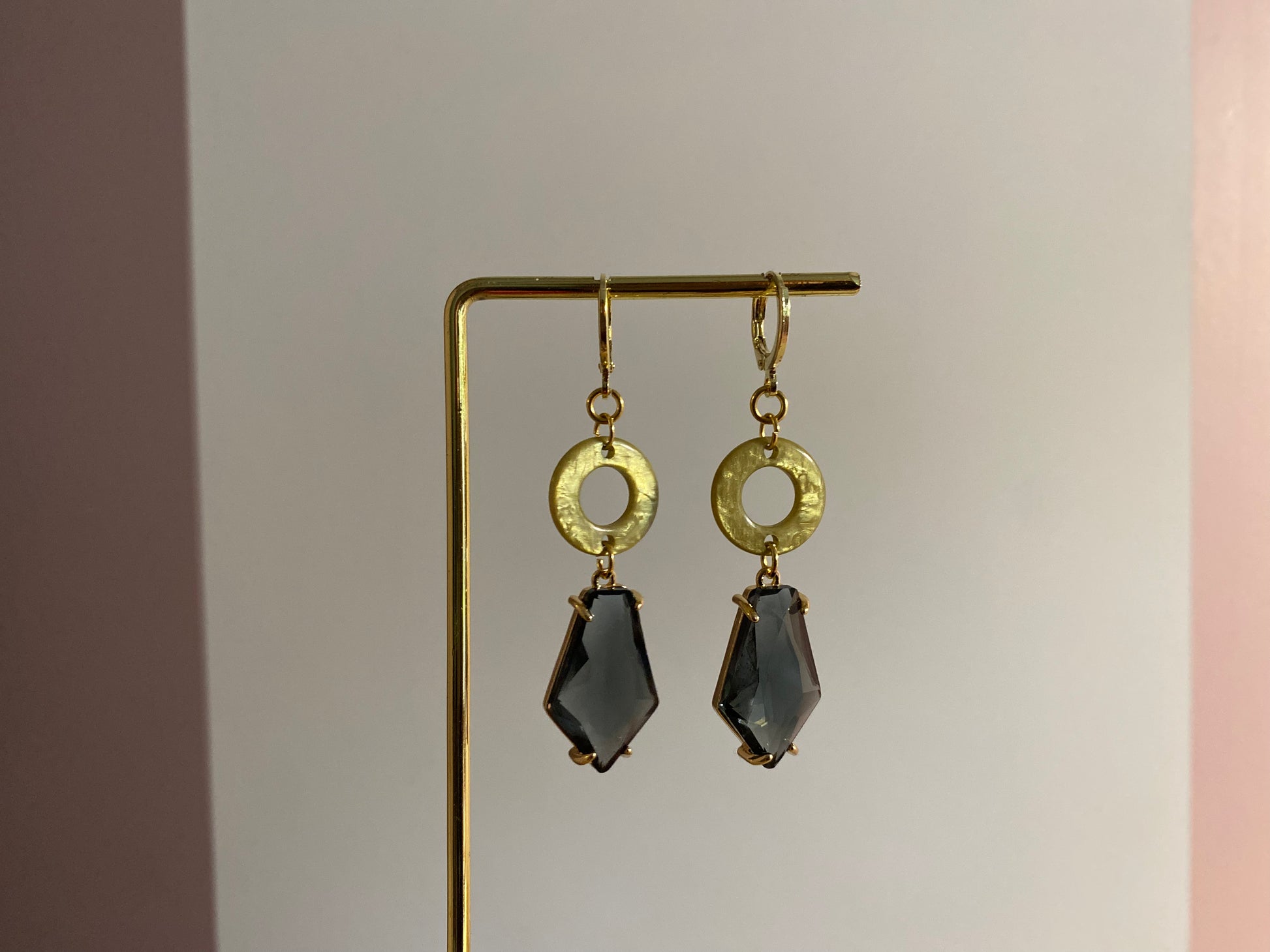 Deze oorbel combineert twee bijzondere elementen in één ontwerp. Aan een 14k vergulde oorring hangt een vijfhoekige grijze glasbedel, met daarboven een ringvormige groene cabochon. Het samenspel van glans en kleur geeft de oorbel een moderne en toch tijdloze uitstraling.