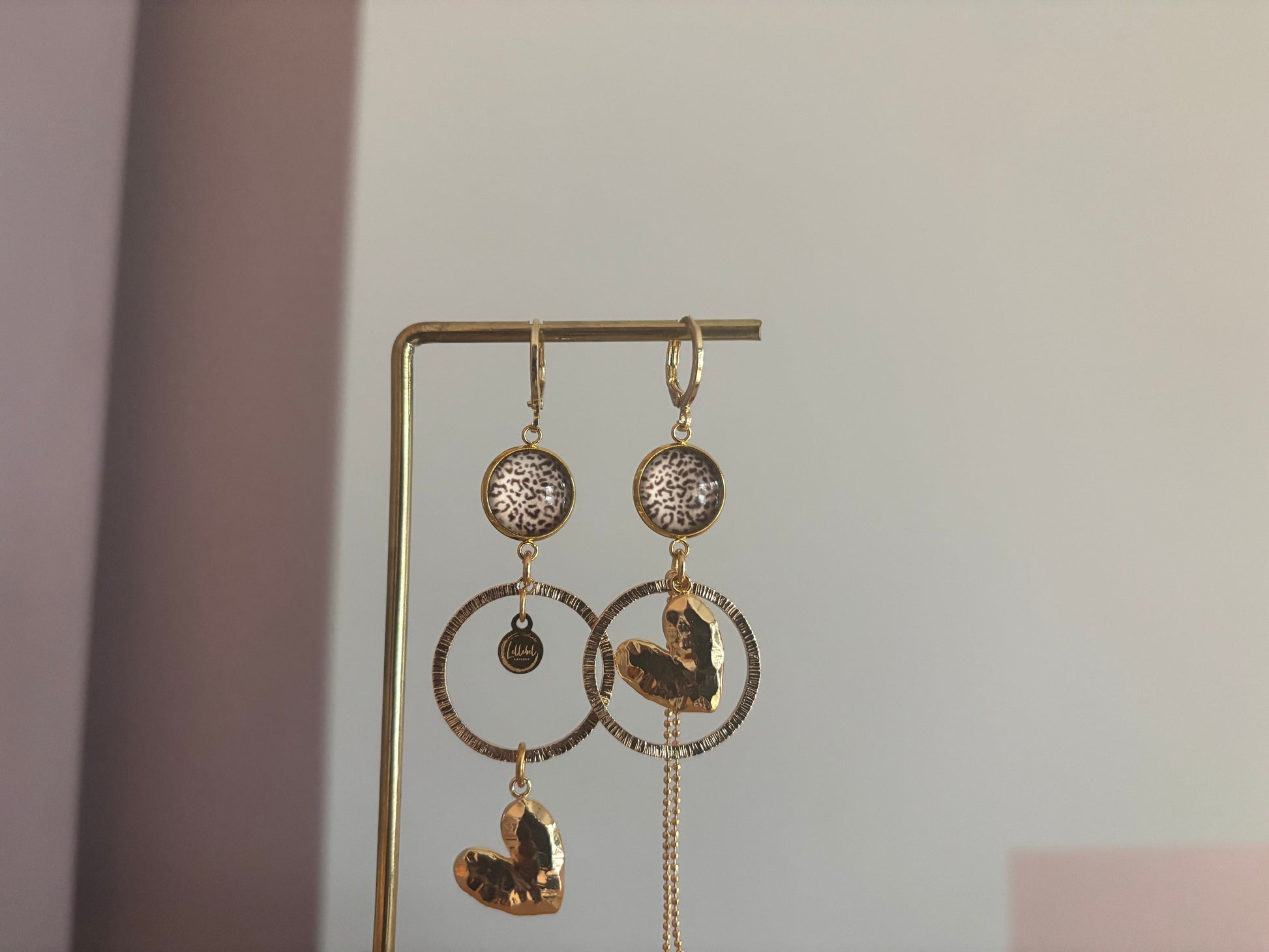 Ivy is er nu ook in panterprint. Dit asymmetrische paar heeft een warme, natuurlijke uitstraling en is perfect voor dit seizoen. De oorbellen combineren een panterprint cabochon met gehamerde ringen, een hartvormige gehamerde bedel en een klein kwastje. De mix van vormen en materialen maakt Ivy speels, stoer, maar rustig in balans.