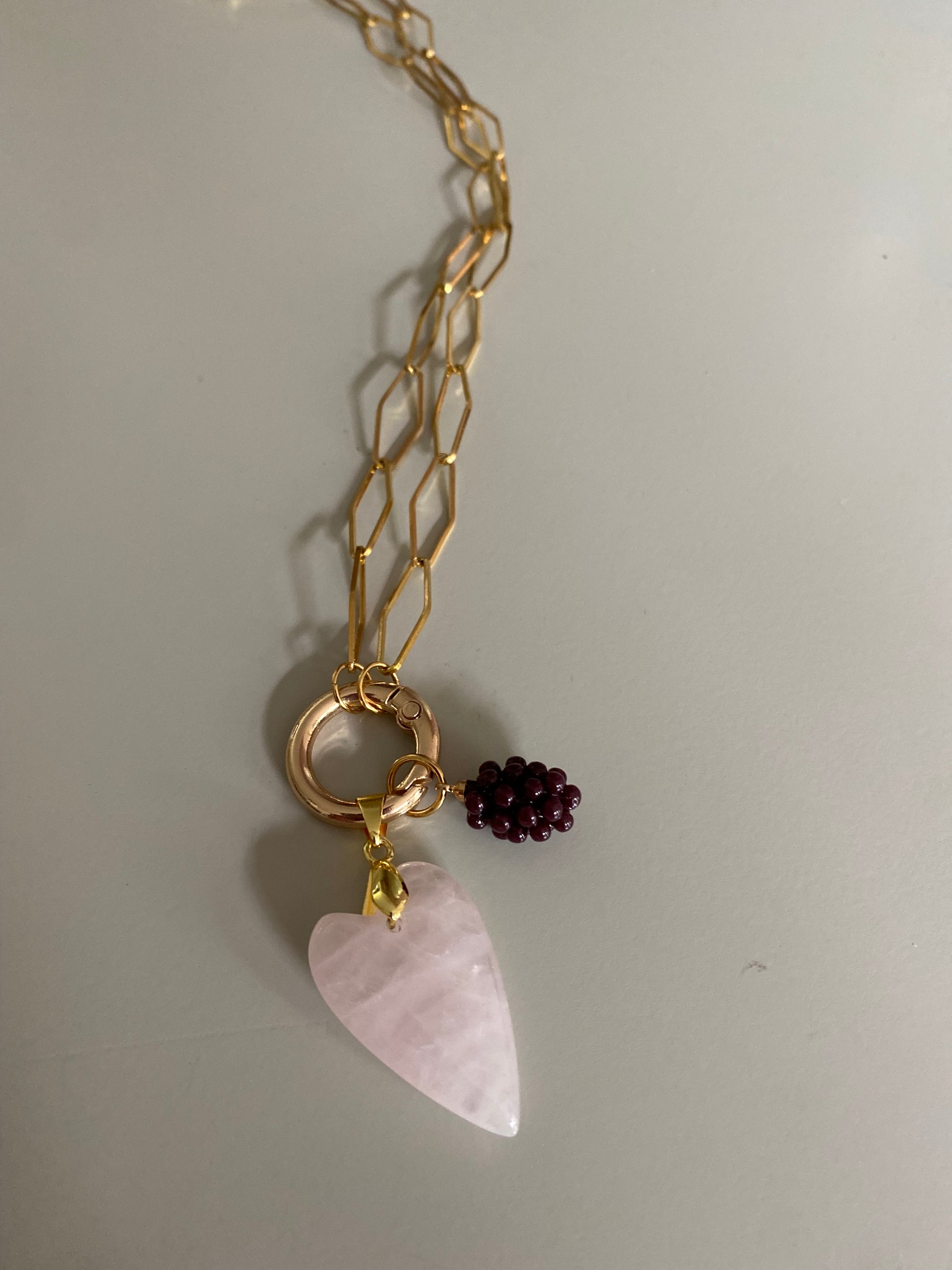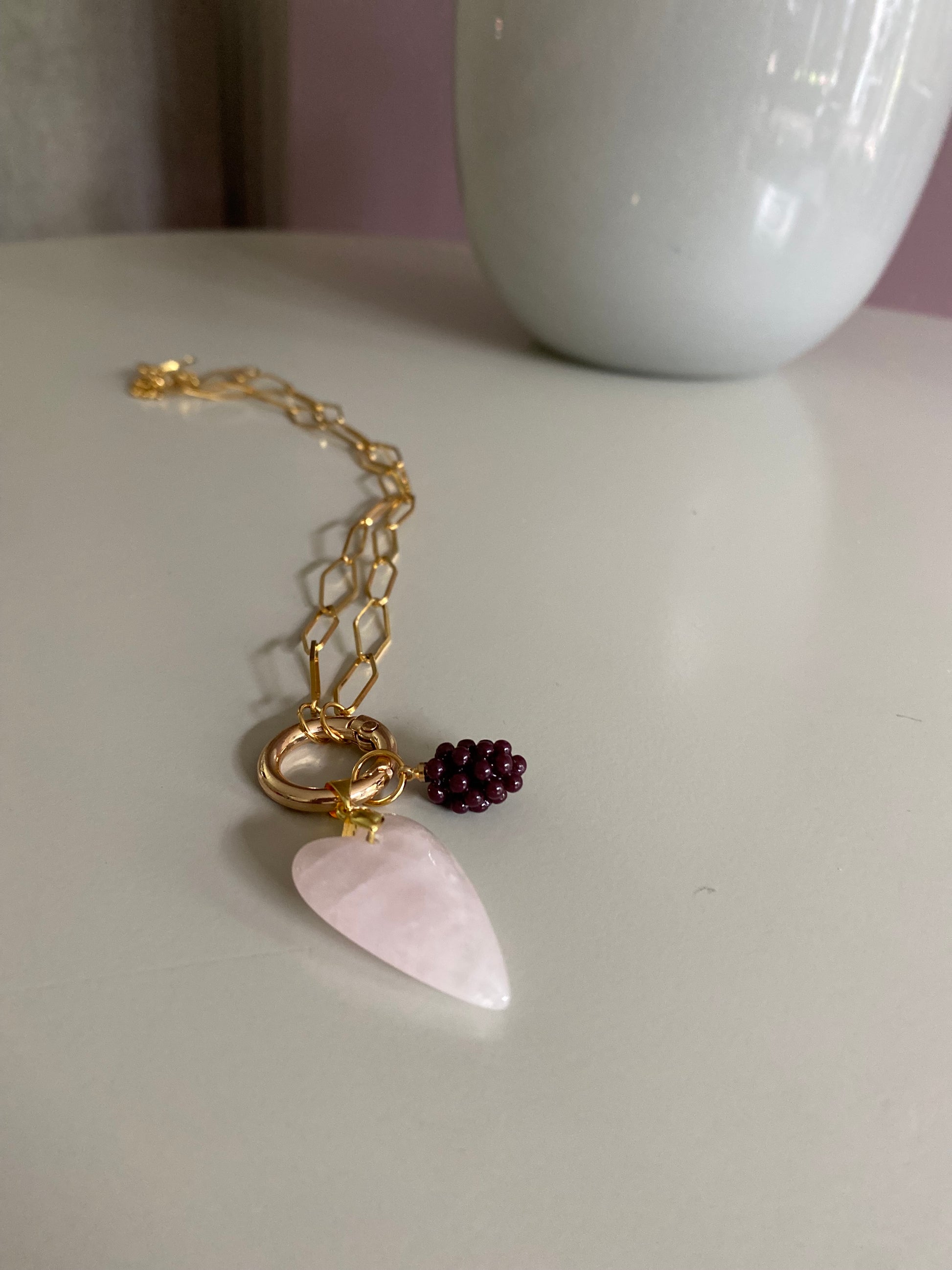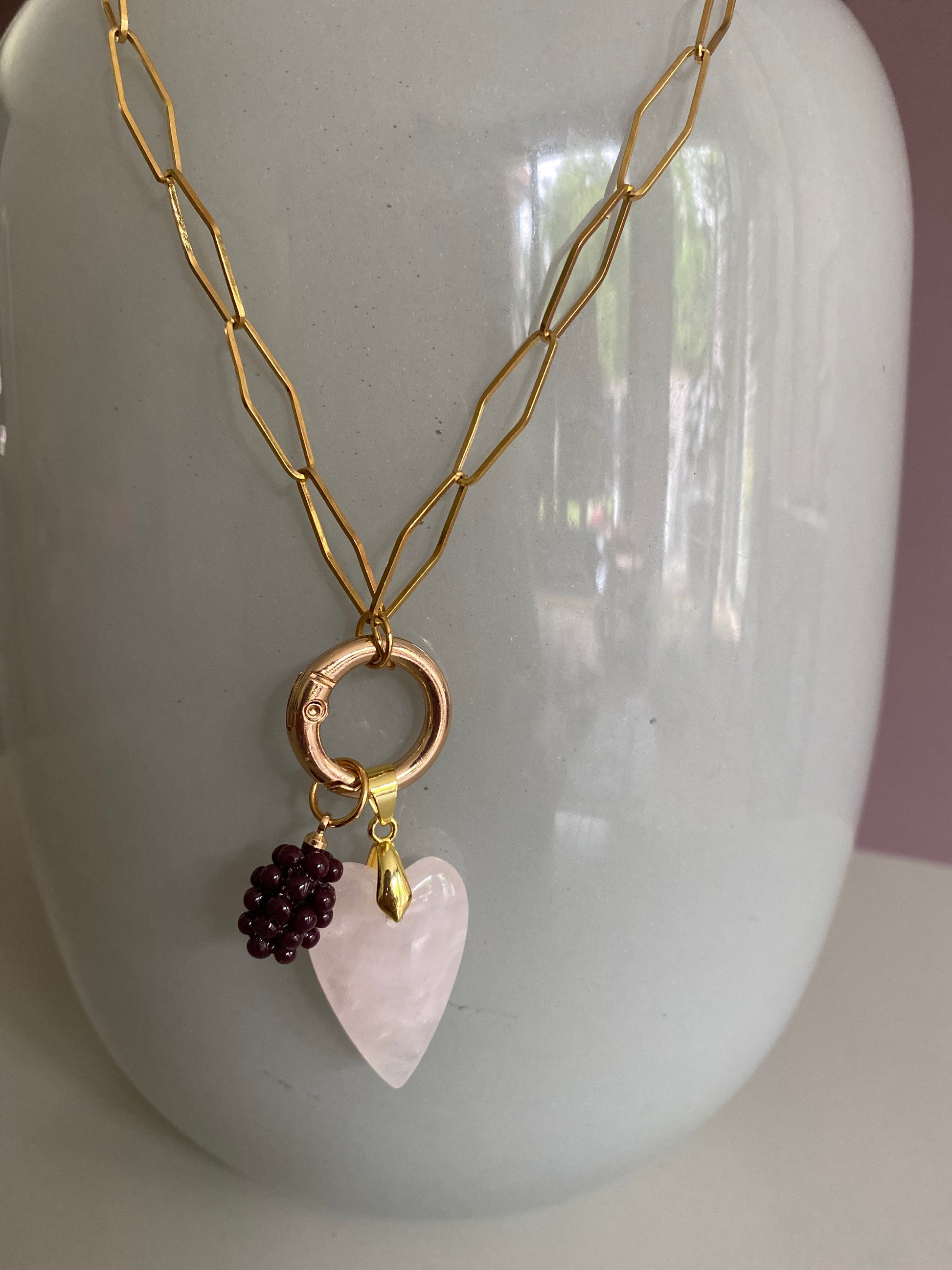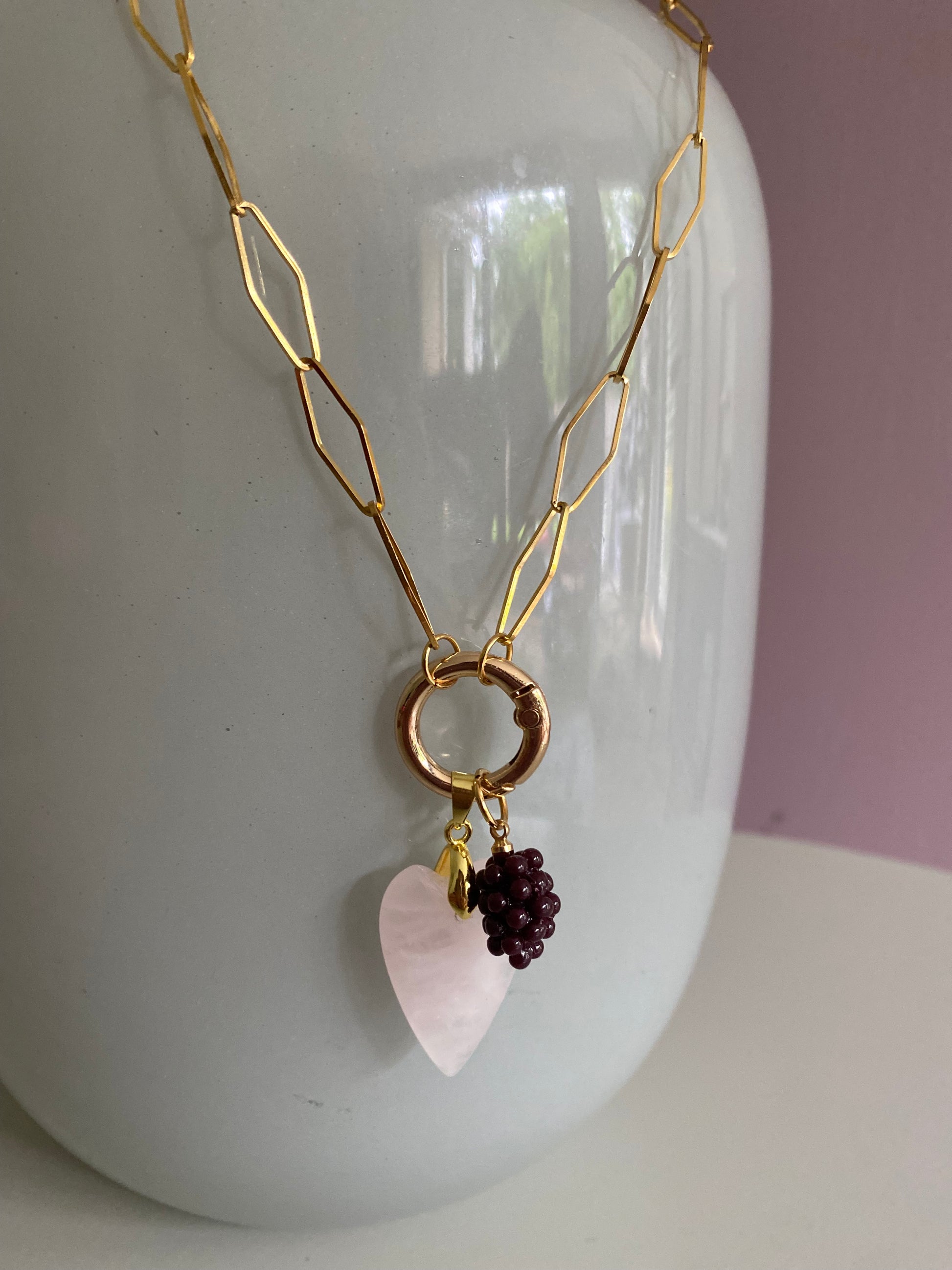 Wat een heerlijke schakelketting is Lot! Gecombineerd met een jade zachtroze natuurstenen hart en een trosje druiven als bedel, is Lot een onwijze vrolijkerd! De bedels zijn dus inclusief! Deze ketting is circa 45 cm lang en nog 2,5 cm aan sluiting. De RVS ronde connector kun je gebruiken om de bedels te wisselen. De ketting zelf is ook stainless steel. Een fantastische ketting is Lot. Zowel voor de zwoele zomermaanden, en straks met de herfst en winter doe je er gewoon andere mooie bedels aan! Duurzaam!